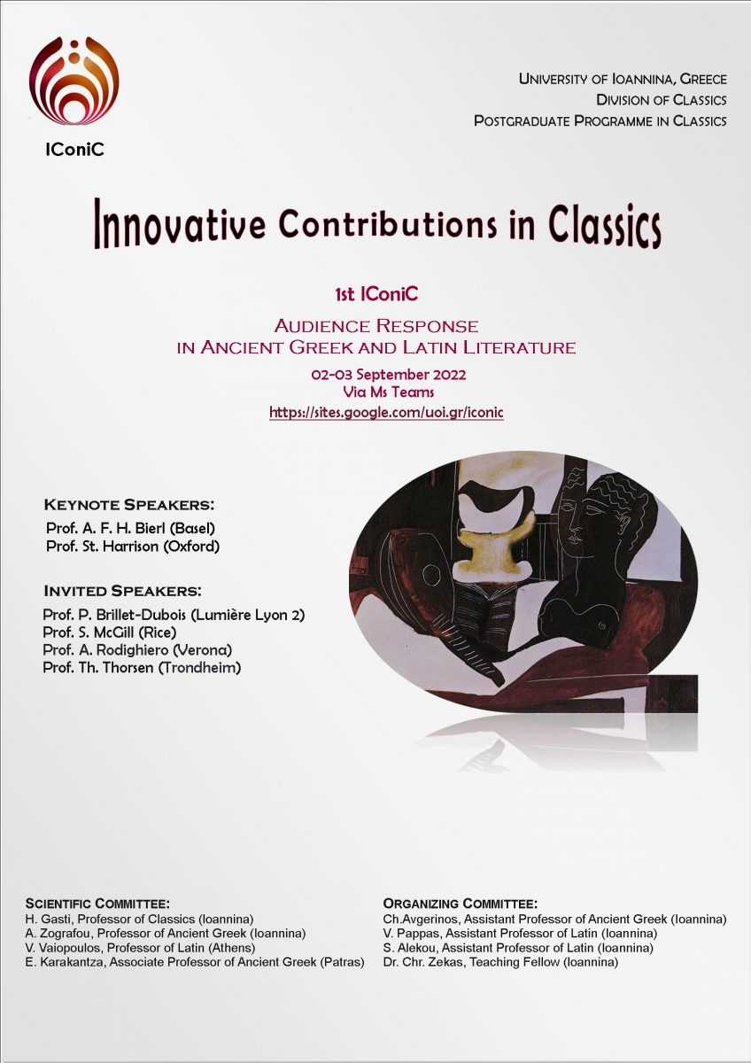 Ο Τομέας Κλασικής Φιλολογίας και το ΠΜΣ ‘Κλασική Φιλολογία’ του Τμήματος Φιλολογίας του Πανεπιστημίου Ιωαννίνων έχουν τη χαρά να σας προσκαλέσουν στο διεθνές συνέδριο που διοργανώνουν, με τίτλο: 1st IConiC (= Innovative Contributions in Classics): Audience Response in Ancient Greek and Latin Literature στις 2 και 3 Σεπτεμβρίου μέσω MSTeams.