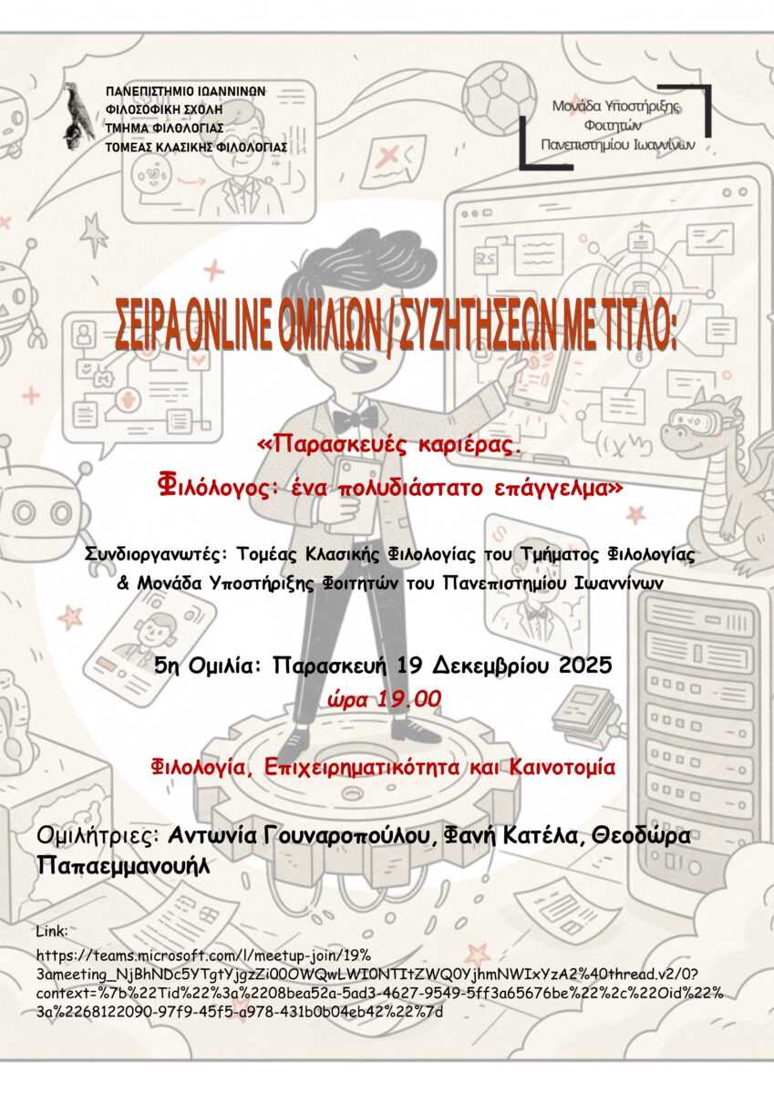 Την Παρασκευή, 19/12/2025, θα πραγματοποιηθεί η 5η συνάντηση της δράσης ‘Παρασκευές καριέρας. Φιλόλογος: ένα πολυδιάστατο επάγγελμα’ που συνδιοργανώνουν ο Τομέας Κλασικής Φιλολογίας με τη ΜΥΦ του Πανεπιστημίου Ιωαννίνων, με θέμα: ‘Φιλολογία, Επιχειρηματικότητα και Καινοτομία‘.